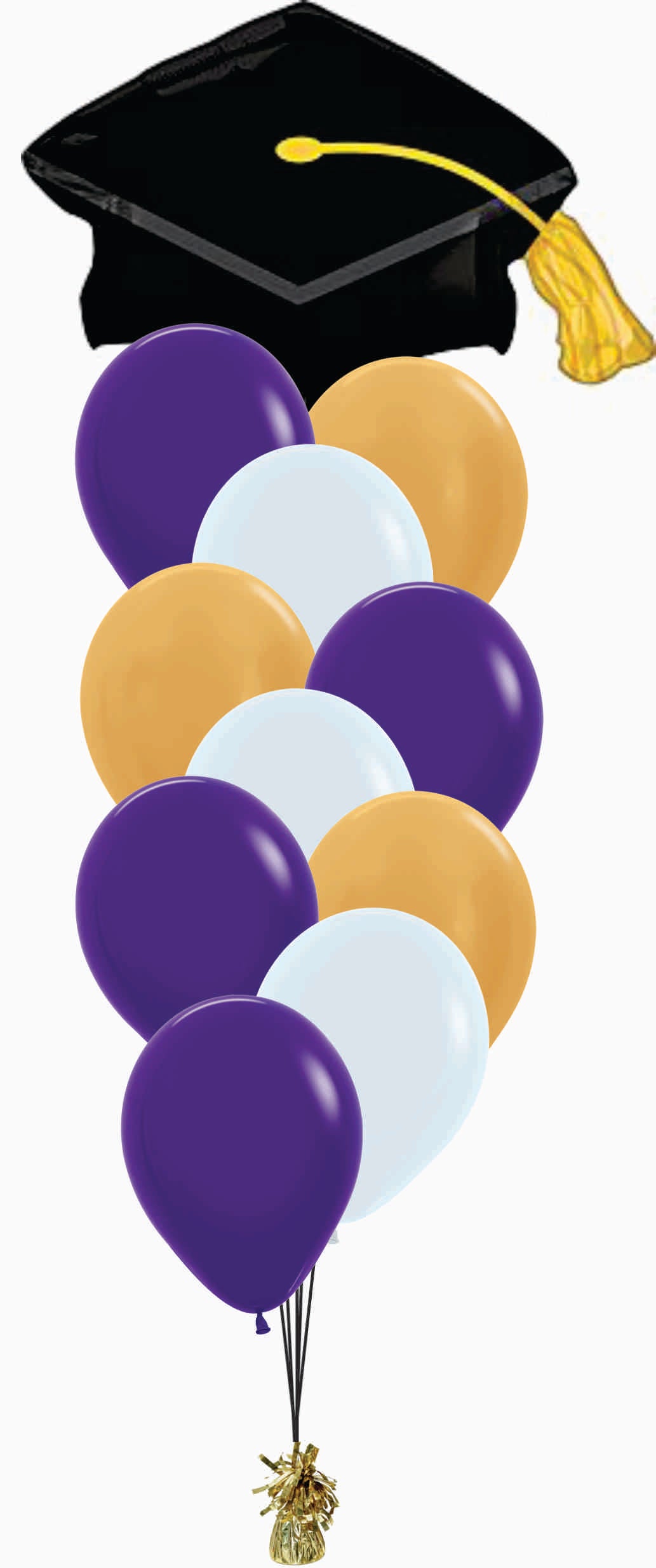 - Ten helium filled premium 11" latex (4 violet, 3 metallic gold, 3 white)