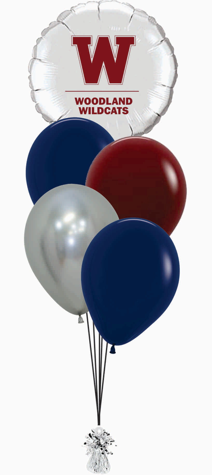 - Four helium filled premium 11" latex (2 navy, 1 merlot, 1 reflex silver)